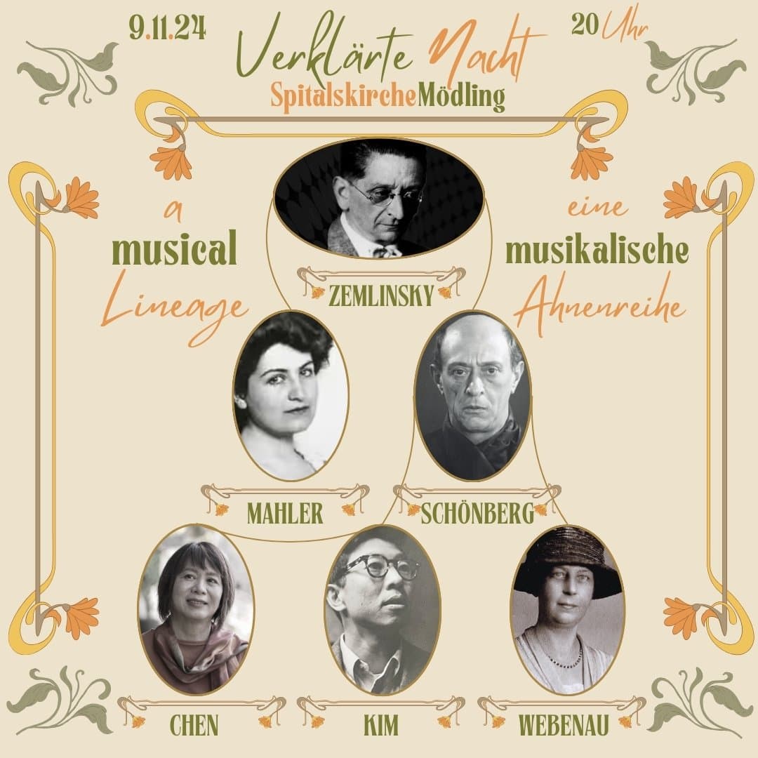 Lineage: What an honor to have my work “Returning Souls” programmed alongside that of my teacher, Earl Kim; his teacher, Arnold Schoenberg; and Schoenberg's teacher, Alexander Zemlinsky, as well as Alma Mahler (a student of Zemlinsky) and Vilma von Webenau (Schoenberg's first student) at the Spitalskirche in Mödling, Austria. This celebration, part of the Schoenberg Center’s commemoration of Schoenberg's 150th birthday, is curated by Melanie Henley Heyn.