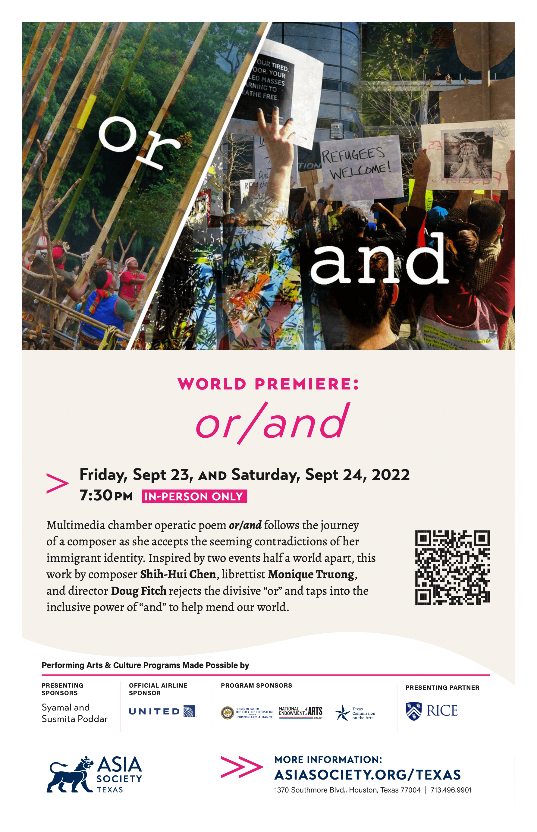 or/and will be premiered at the Asia Society Texas Center (April), University of Heidelberg (July) and the soundSCAPE festival in Italy (July). or/and is a multimedia chamber operatic poem, following the journey of a composer who finds her voice only when she accepts the seeming contradictions of her immigrant identity. Choosing “and” over the divisive “or,” this work taps into the inclusive power of AND to help mend our divided world.